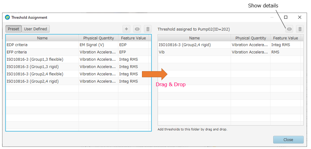 To apply a threshold to this folder, drag and drop the threshold setting from the left table to the right table.