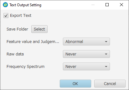 When saving data, the data is always saved in Sigma in binary format, but you can optionally export the feature values, judgment results, raw waveforms, and FFT as a CSV format text file. For details, please refer to Text export.
