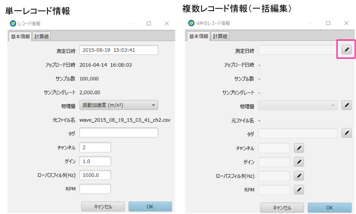 Sigmaにおける「レコード」は、1回の測定データを表します。基本的には、振動加速度データのように比較的高いサンプリングレートで収録された数秒~数十秒程度のデータを 1レコードとするような使用法が想定されています。複数チャンネルの時系列データが記録された1つのファイルを読み込んだ場合、チャンネル数分のレコードがSigma内に記録されます。 通常1つのレコードは1つの信号波形データを保持します。(信号波形データの削除を行った場合は例外です。)