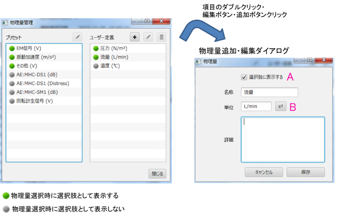 物理量管理画面で項目をダブルクリックするか、追加ボタンまたは編集ボタンをクリックすると、物理量追加・編集ダイアログが表示されます。